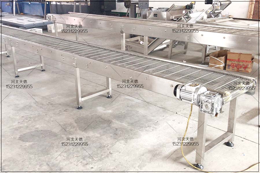 網鏈輸送機的長度是2.5米,有效使用寬度是450毫米,輸送高度為1米,網鏈輸送機是選擇鏈條輸送帶來輸送膠條的,鏈條輸送帶的絲徑為1.5mm,孔徑為10*20mm,為了能夠實現膠條在水里面進行冷卻,我們需要在輸送機的底部安裝接水槽,接水槽里面放上需要的水量。整機要采用不銹鋼304材質。每分鐘輸送20米。