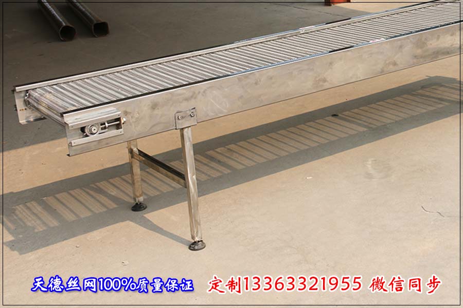 一臺(tái)實(shí)用的網(wǎng)帶輸送機(jī)它長(zhǎng)度、寬度等參數(shù)都是有一定比例關(guān)系的一般來(lái)講網(wǎng)帶輸送機(jī)的寬度不能超過(guò)2米,長(zhǎng)度不能超越30米。如果輸送物料體積大、密度大那就要在網(wǎng)帶下方加裝軌道支撐;如果輸送線(xiàn)比較長(zhǎng)的話(huà)把網(wǎng)帶輸送機(jī)分節(jié)來(lái)制作而不能做成一條輸送線(xiàn),因?yàn)榫W(wǎng)帶輸送機(jī)超過(guò)30米的話(huà)輸送網(wǎng)帶在牽引力下延伸率太大,造成輸送機(jī)脫軌或者跑偏。